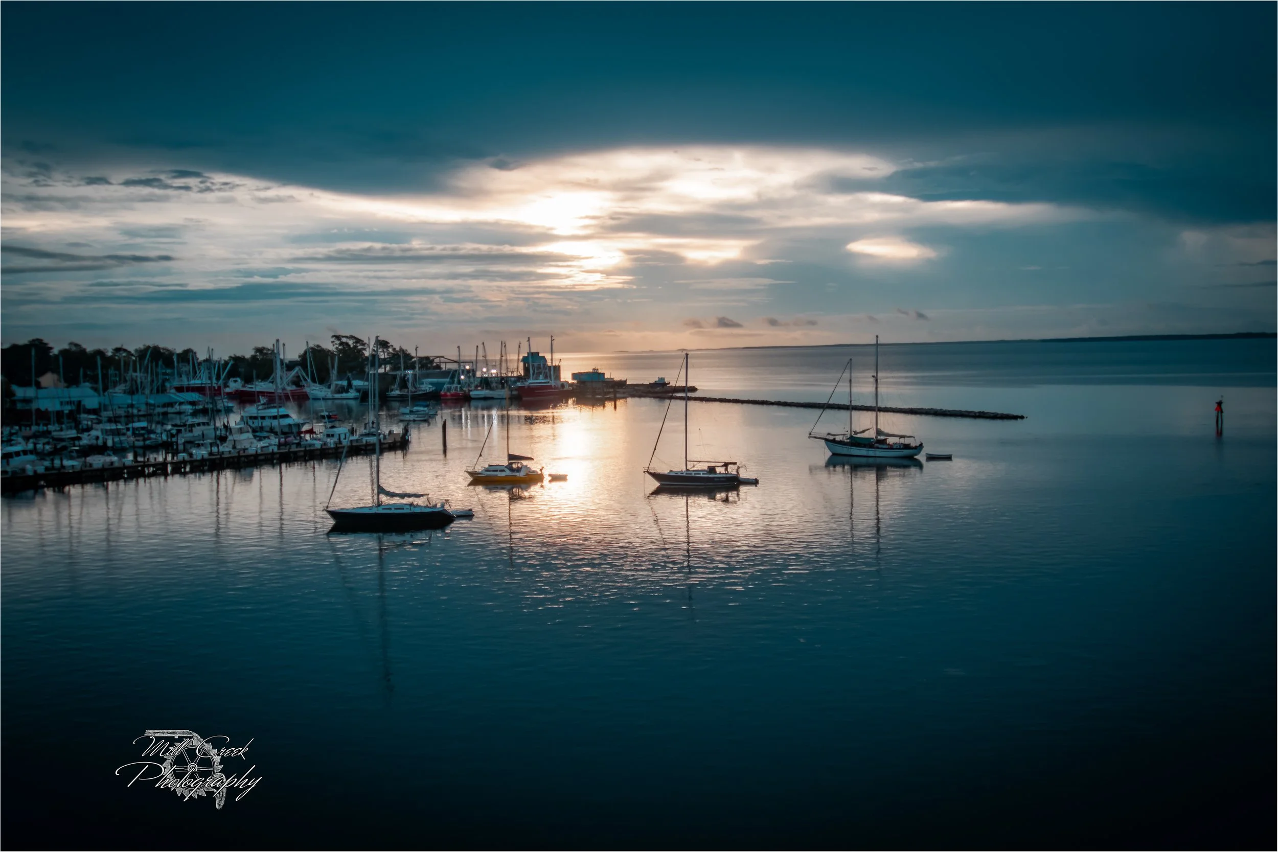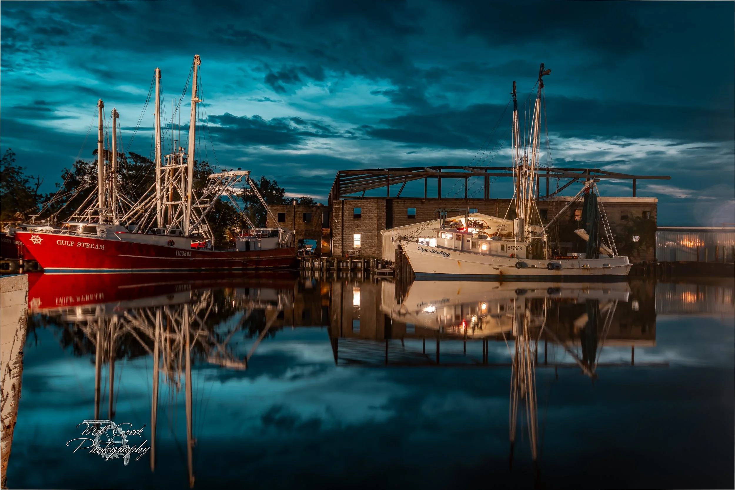 Beneath the weight of twilight skies, the waters of Oriental Harbor and the Pamlico Sound become mirrors of stillness. Shrimp boats rest in quiet dignity, their masts etched against the fading night, while reflections dance across the glassy surface below. Along the shoreline, the first glow of light flickers to life, reminding us that even in the hush of sunrise, the coast holds its own kind of song — one of resilience, beauty, and timeless grace.