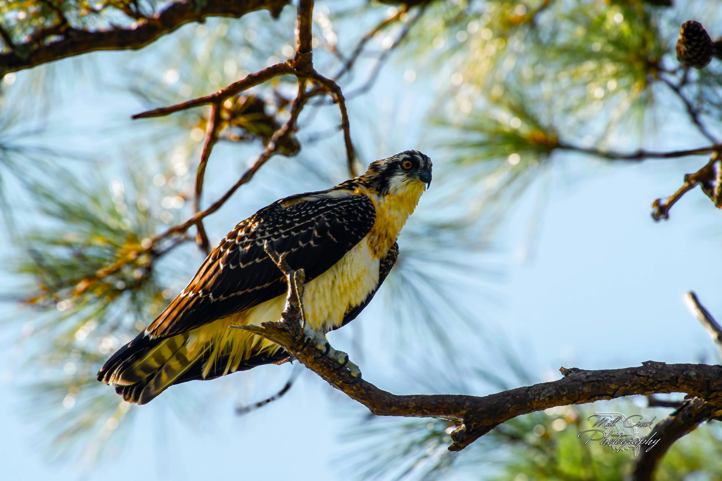 "Young Osprey in Pine Tree" Perched among the pines, a juvenile osprey watches the world with intense amber eyes. Its feathers, still touched with youthful markings, hint at the strength of the hunter it will become.