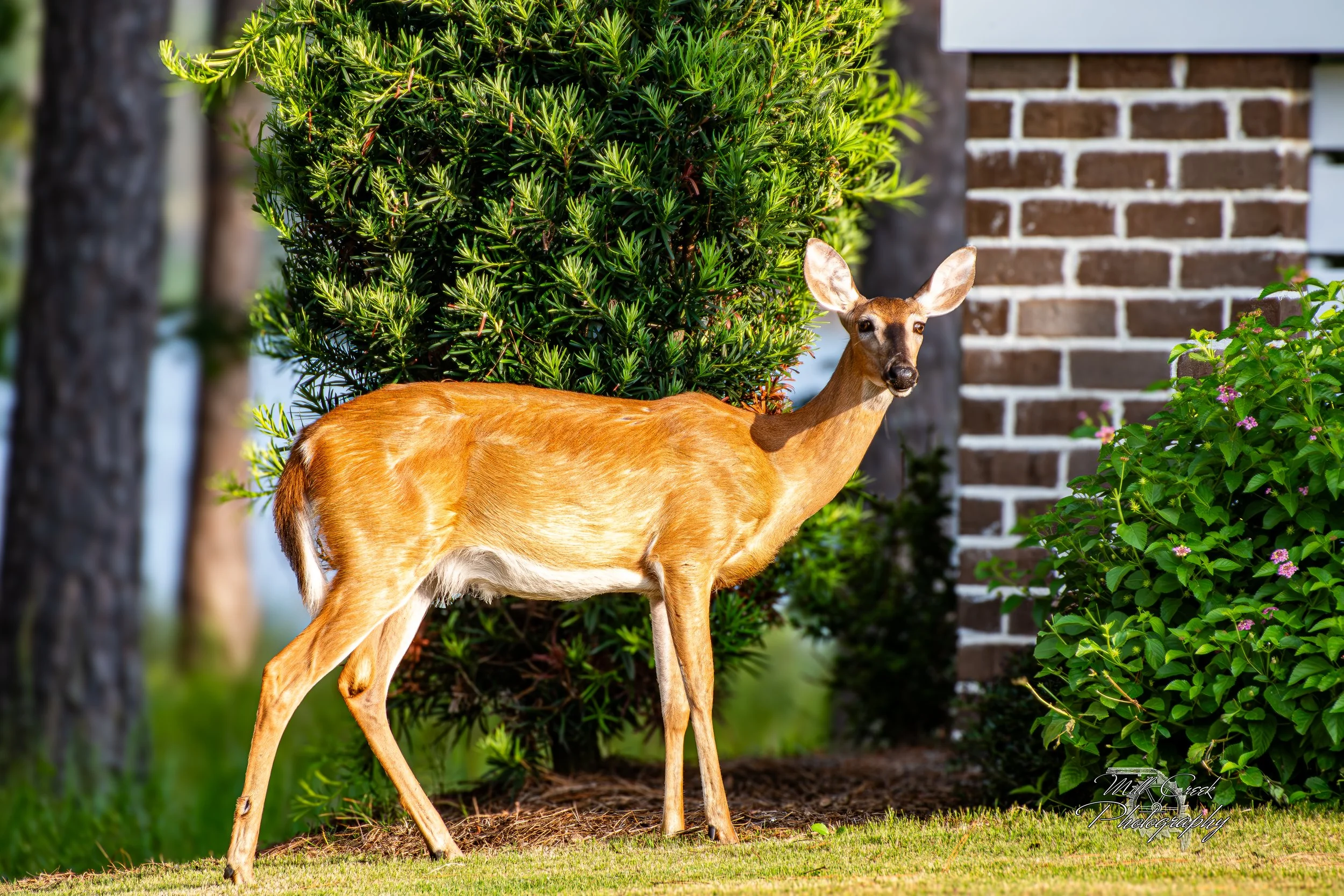 "Deer Comes Calling" A graceful doe pauses at the edge of a yard, framed by manicured shrubs and brickwork. Her cautious curiosity bridges the meeting point of neighborhood life and untamed wilderness.